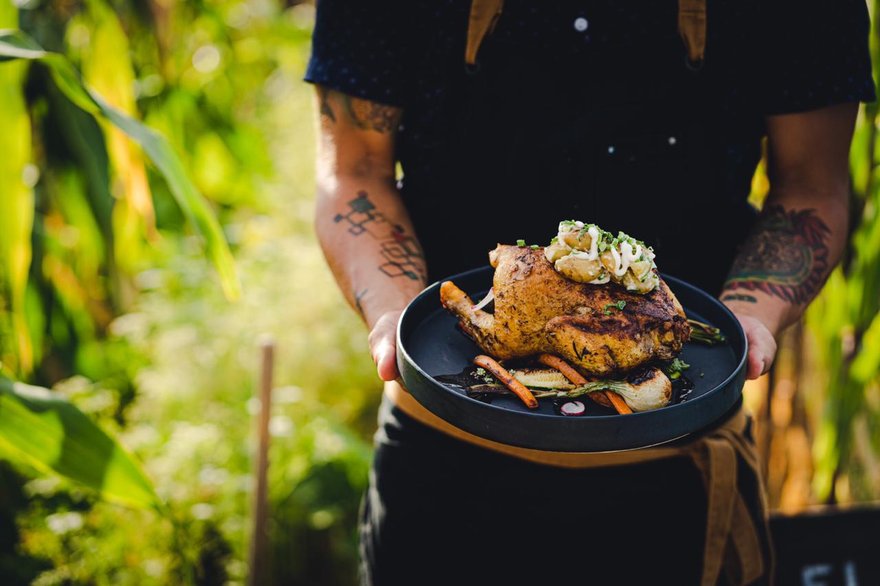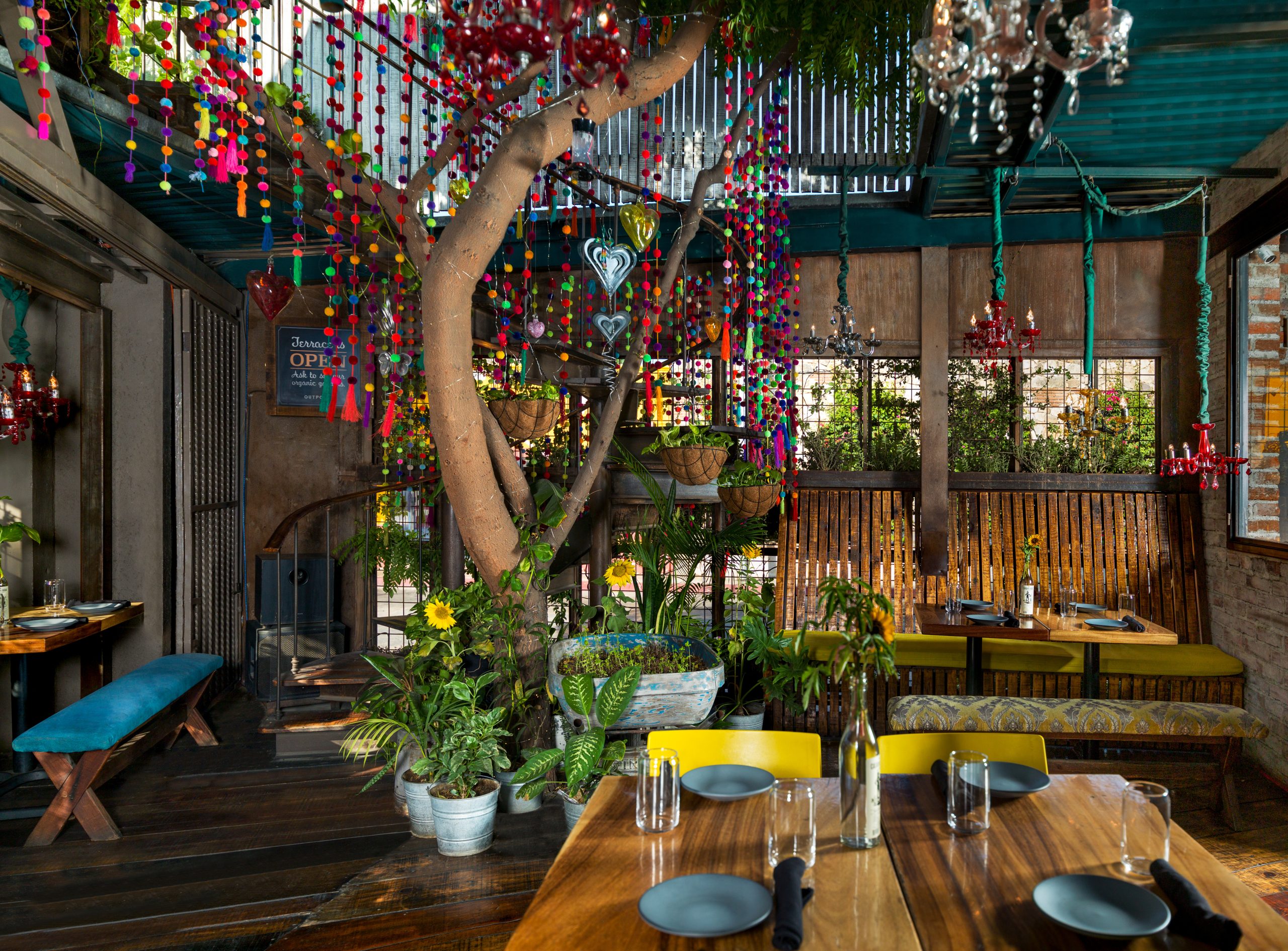 Una terraza orgánica con mixología fresca y cocina farm-to-table utilizando ingredientes cultivados en más de 30 jardines elevados.